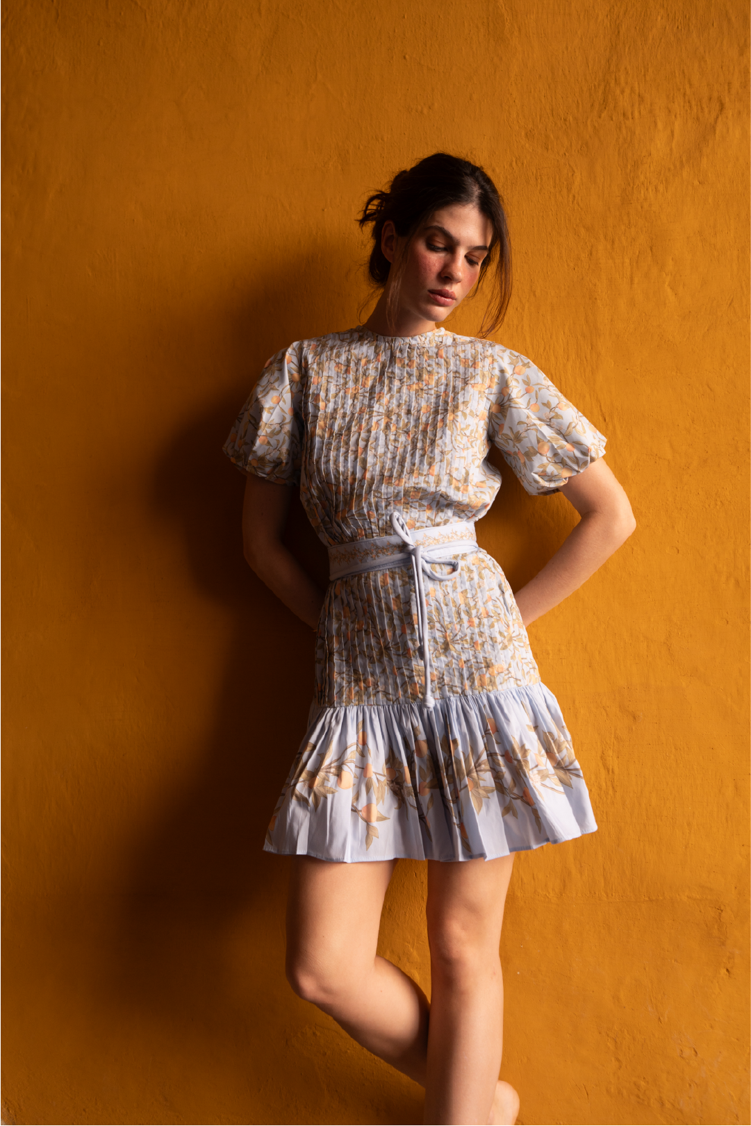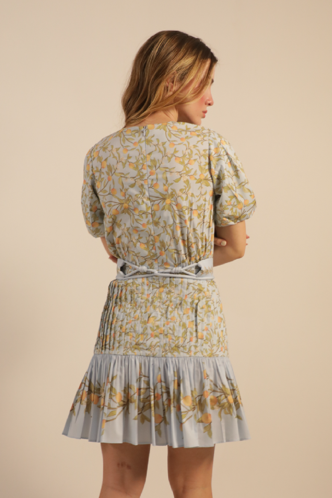 FIT. Mini mini dress with a pleated top, sleeve detailing, and an invisible back zipper. It features an adjustable and removable belt and a pleated skirt with a bolero.